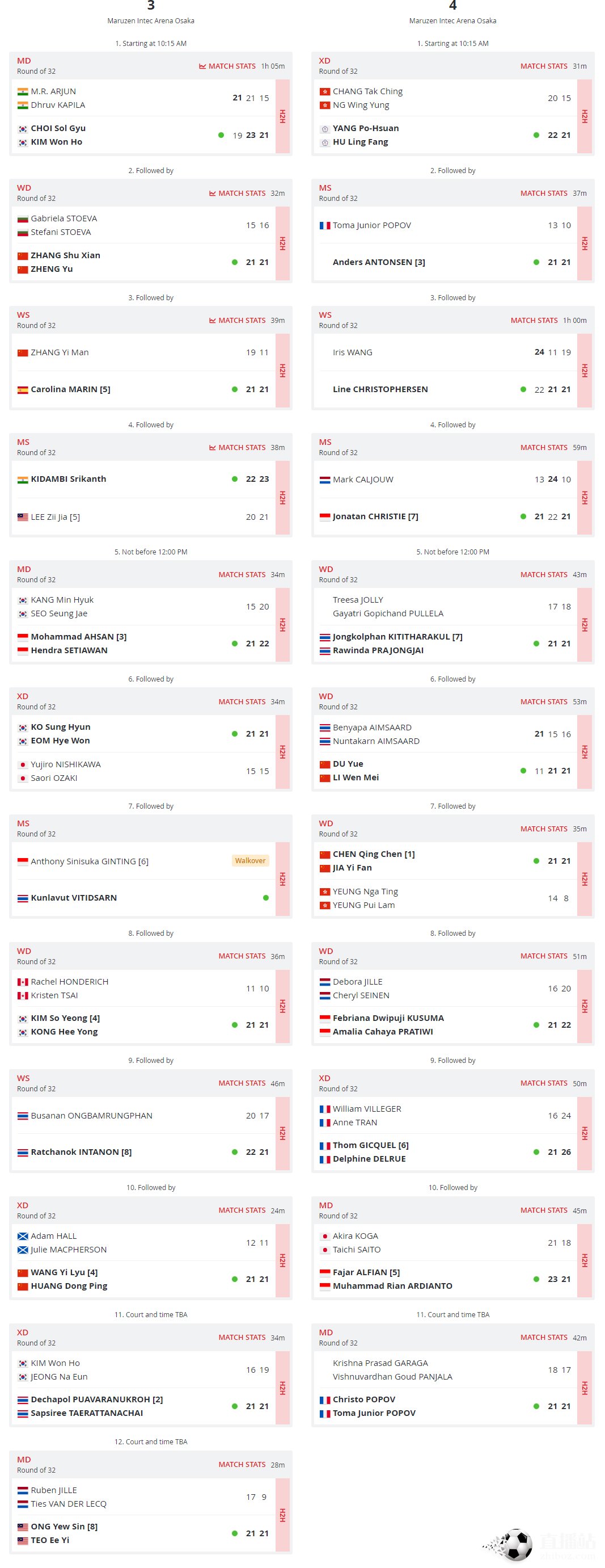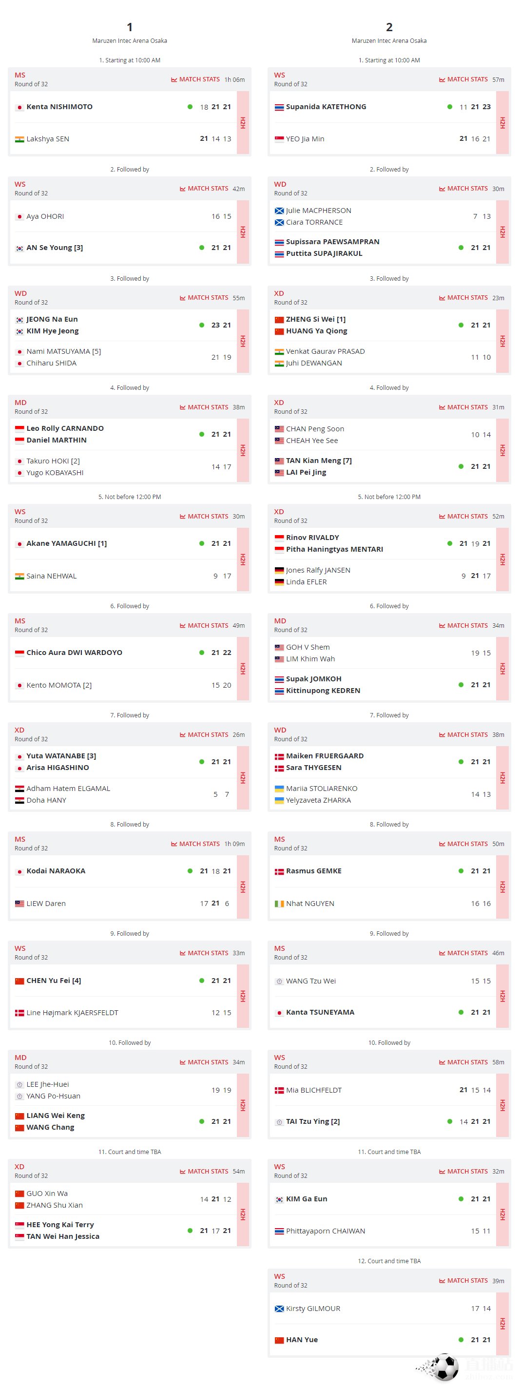 2022羽毛球日本公开赛第2日各场地比赛结果